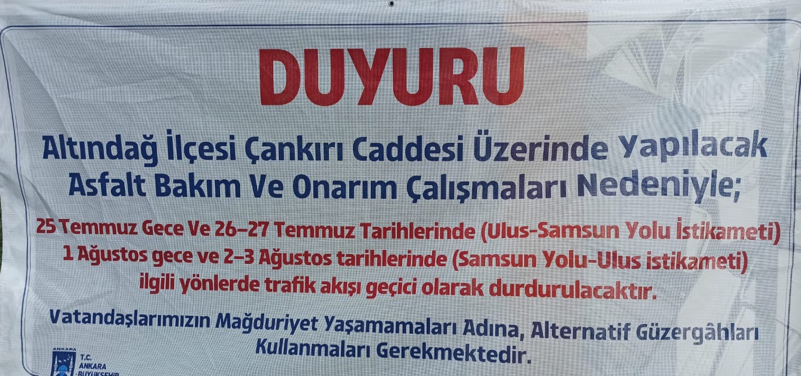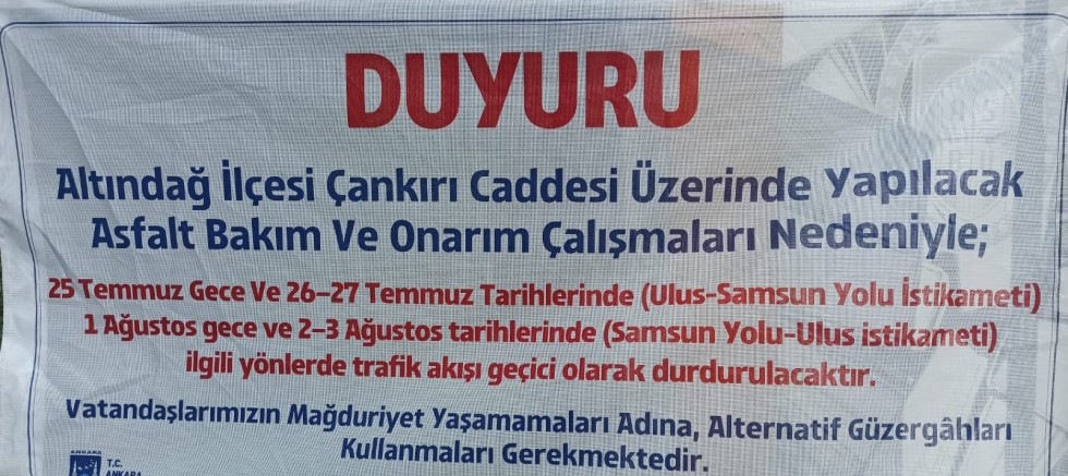 Altındağ Belediyesi'nin resmi duyurusunda; Çankırı Caddesi üzerinde yapılacak asfalt bakım ve onarım çalışmaları kapsamında;